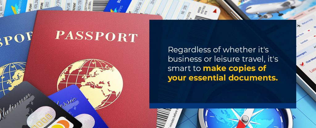 - Back up documents: Regardless of whether it’s business or leisure travel, it’s smart to make copies of your essential documents — like your passport, hotel reservations and flight details — and store them in the cloud or a password-protected USB key. You might also want to provide a copy to a trusted co-worker, just in case.