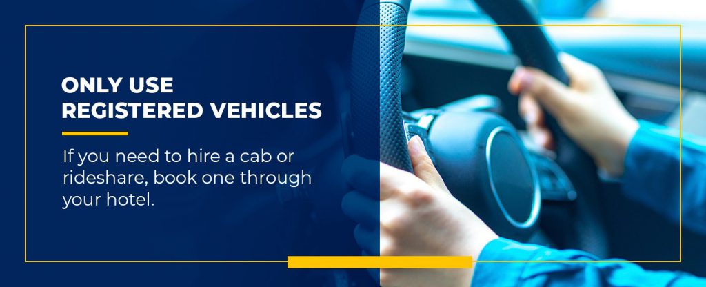 - Only use registered vehicles:Â Some countries are notorious for illegal taxi drivers who prey on unsuspecting tourists. If you need to hire a cab or rideshare, book one through your hotel. You can also research how to tell fake cabs from legitimate ones, in case you ever need to hail a cab when out and about on your own.