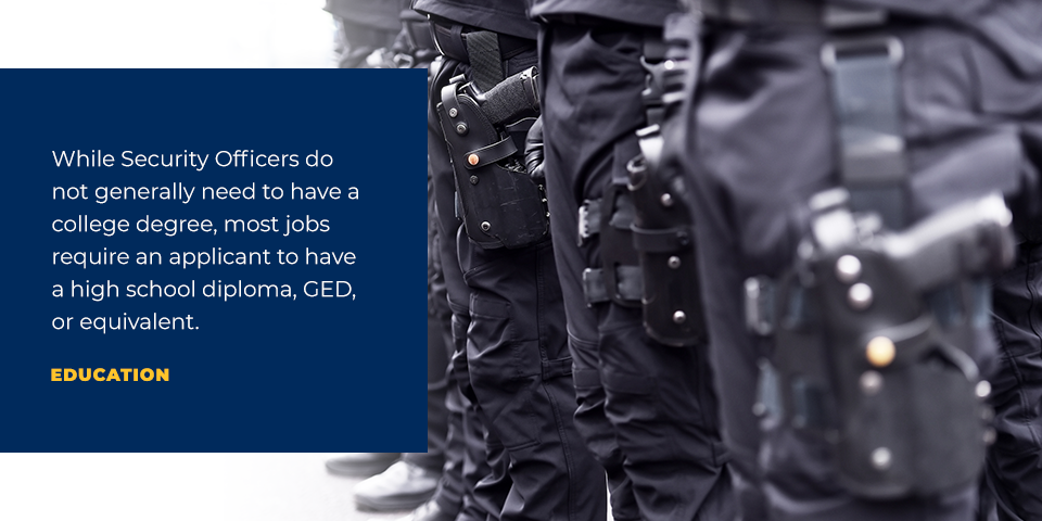 While Security Officers do not generally require to have a college degree, most jobs require an applicant to have a high school diploma, GED, or equivalent. The specific training requirements to become a Security Officer vary from state to state.Â