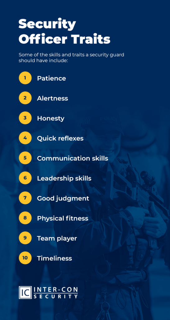 - Timeliness: Many facilities need protection around-the-clock, so security guards often work in shifts. Being on time is a valuable trait in security guards, as they will most likely be relieving another team member from their shift. Timeliness also shows that a person takes their work seriously, that they respect others, and that they are willing to show up when needed.